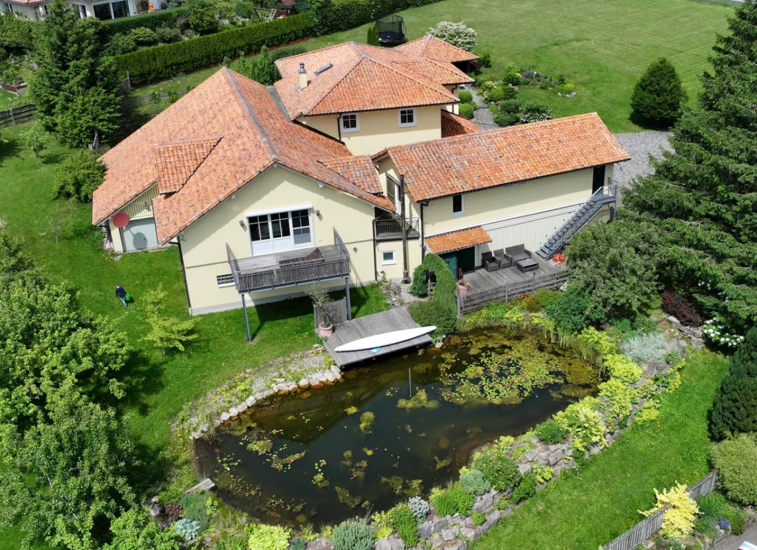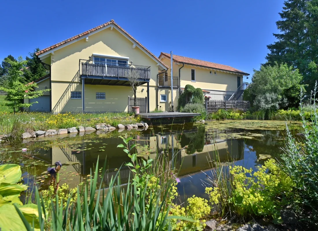 - Naturteich (ca. 18 × 10 m, bis zu 2,80 m tief) als zentrales Highlight im Garten