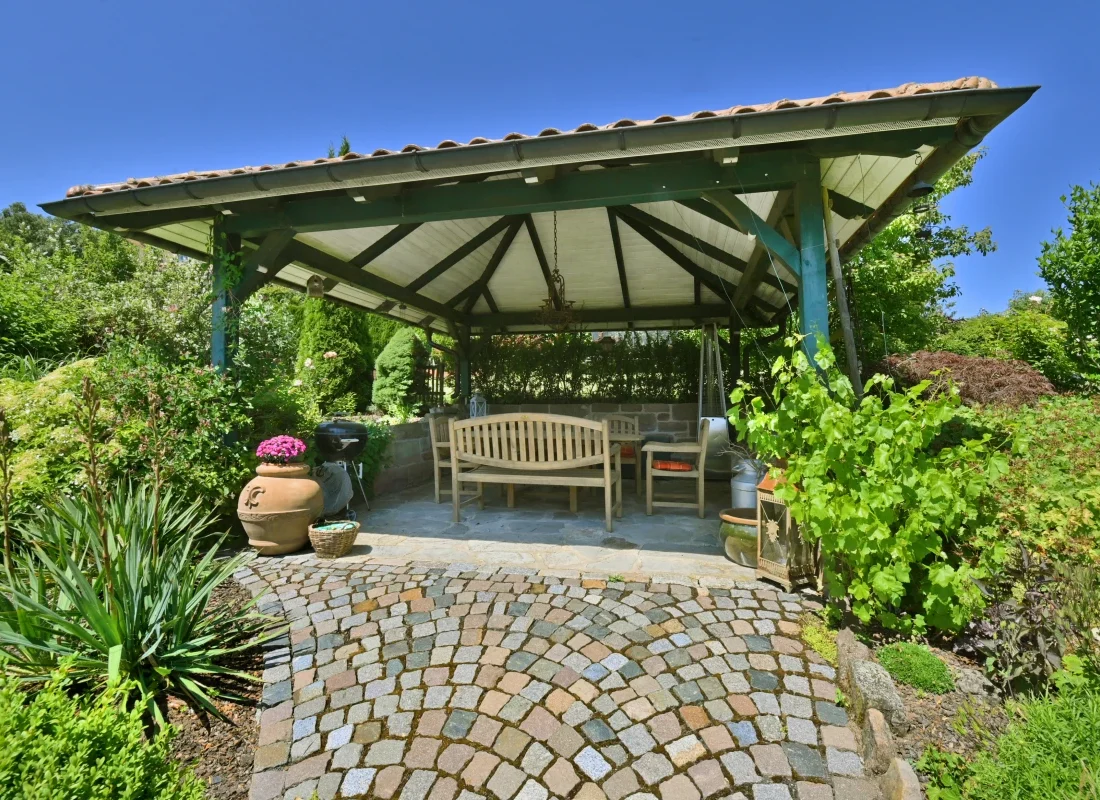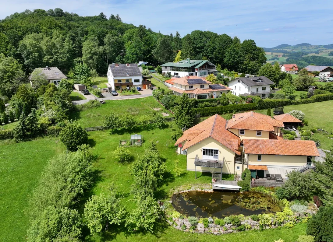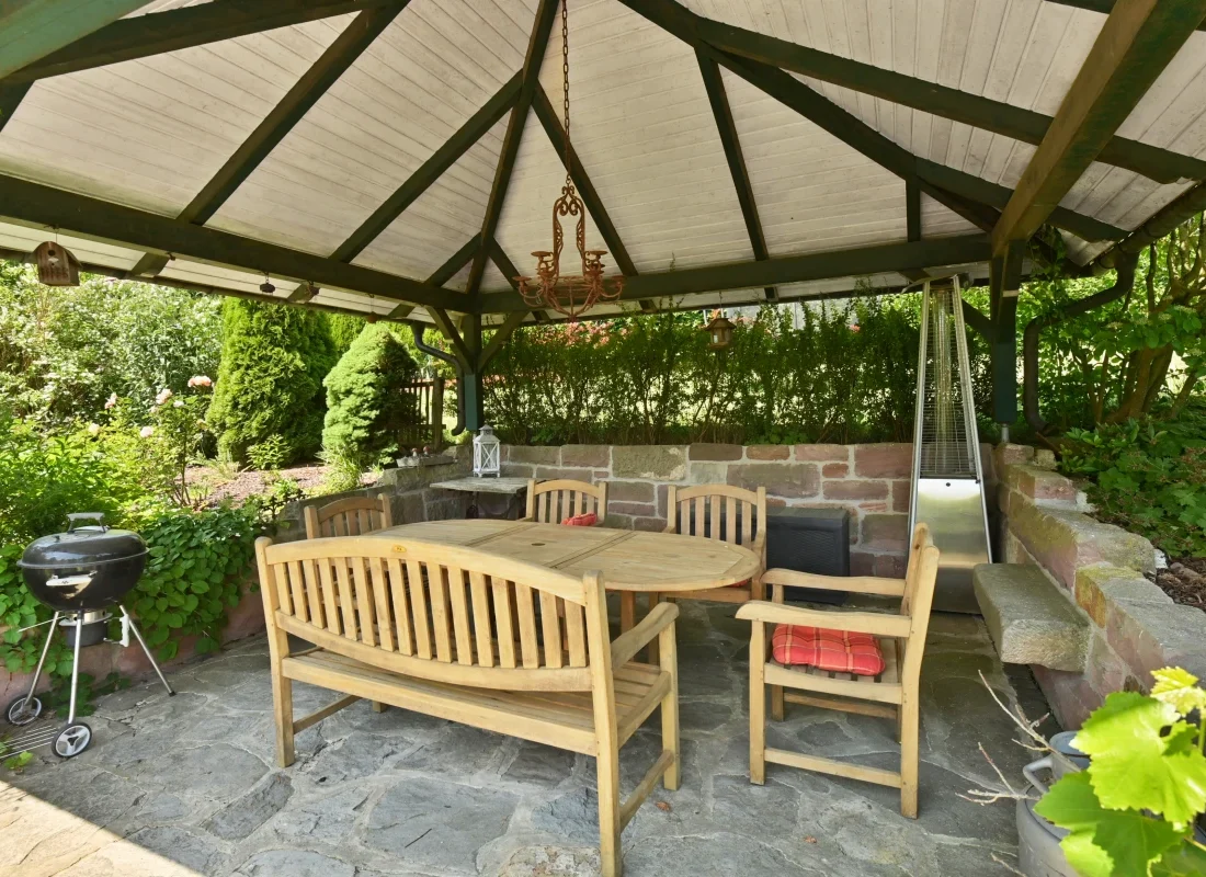 Der weitläufige Garten begeistert mit einem großen Naturteich, Holzterrasse, Obstbäumen, Gewächshaus und einem charmanten Pavillon mit Sandsteinmauer – perfekt für gesellige Abende oder stille Momente. Die liebevoll gestaltete Außenanlage schafft eine Atmosphäre, in der die Zeit stillzustehen scheint.