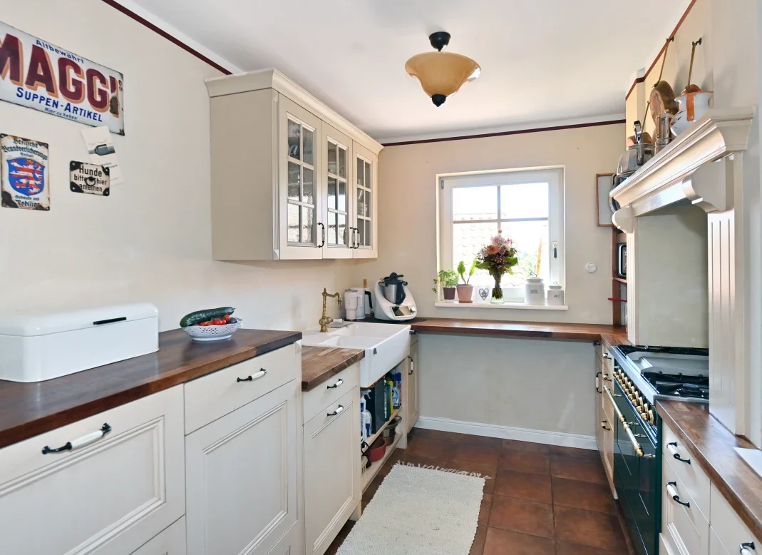 - Maßgefertigte Einbauküche mit großem ILVE Gasherd und Echtholz-Arbeitsflächen